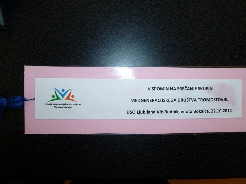 V prijaznem in gostoljubnem vzdušju Doma starejših občanov Ljubljana Vič Rudnik, na Bokalcih, se je 22. oktobra 2014 odvijalo prvo druženje skupin starih ljudi za samopomoč, ki delujejo po okriljem Medgeneracijskega društva za samopomoč Tromostovje. To so skupine, ki se srečujejo na območju Mestne občine Ljubljana in v Medvodah. Na srečanju se je vsaka skupina predstavila v besedi, nekatere pa tudi v pesmi in z glasbo. Za popestritev smo zapeli nekaj narodnih pesmi ob harmoniki in citrah. Poslovili smo se z željo, da to srečanje postane tradicionalno.